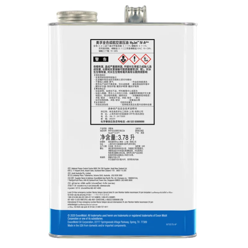 Hyjet IV A Plus is a high-performance aviation hydraulic fluid that provides exceptional thermal stability, anti-wear properties, and corrosion resistance. This product is a synthetic hydraulic fluid that is basically designed for use in aircraft systems where reliability and performance are critical. HYJET IV A PLUS is a fire-resistant phosphate ester hydraulic fluid deigned for use in commercial aircraft.